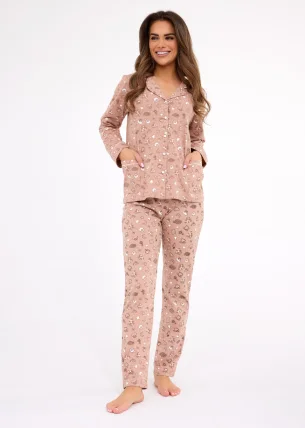 Całość utrzymana jest w beżowym kolorze, ozdobionym słodkim nadrukiem babeczek, ciasteczek i śnieżynek. Dzięki miękkiej i przyjemnej tkaninie piżama otula ciało, zapewniając komfort w chłodniejsze jesienne i zimowe wieczory.