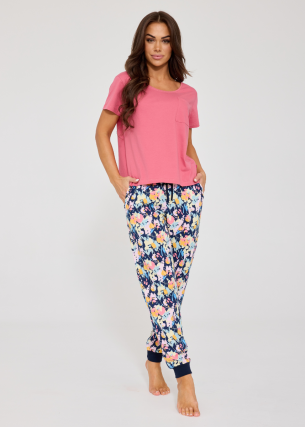 Kobieca piżama damska – delikatny róż i letnie spodnie 7/8 w kwiaty
