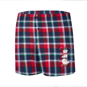 Luźne bokserki świąteczne z zabawnym nadrukiem na udzie. Tło bokserki stanowi świąteczna granatowa krata. Nadruk na nogawce to zabawne bałwanki. Bokserki te to ciekawa propozycja wyjątkowej bielizny męskiej dla osób z wyczuciem stylu i jednocześnie dla tych, którzy z dystansem podchodzą sami do siebie. Komfortowe bokserki zawdzięczają swoje właściwości elastycznemu materiałowi, a także precyzyjnemu wykonaniu. Płaskie szwy są delikatne dla skóry i zapewniają maksymalny komfort. Bokserki są zapakowane w estetyczne pudełeczko.